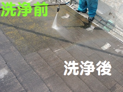 ⑦屋根塗装の基本は高圧洗浄です。しっかりコケや排気ガスのススを落とさないと、ペンキが剥がれてしまいます。
