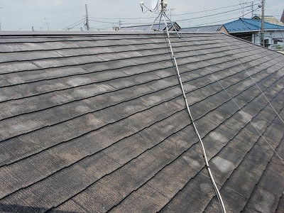 洗浄後の屋根は表面の皮膜が落ち「カサカサ状態」です。 塗装している所が黒くなっているのは、黒い塗料を塗っているのではありません。