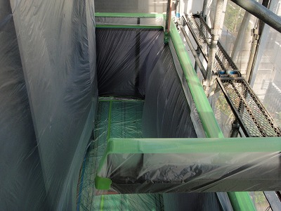 足場の中から見るとこうです。このようにメッシュシートの内側にブルーシートを張り、絶対に塗料が飛ばないように対策を施します。 |