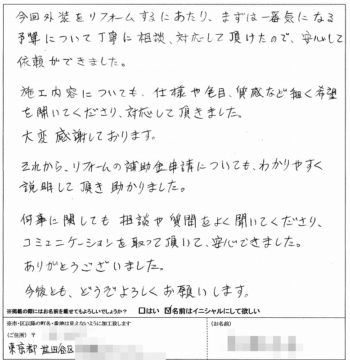 世田谷区のお客様から外壁塗装のご感想をいただきました(*^_^*)!何事に関しても相談や質問をよく聞いてくださり安心でした。