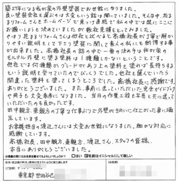 世田谷区のお客様から外壁塗装のご感想をいただきました(*^_^*)ジョリパッド系外壁の塗料♪