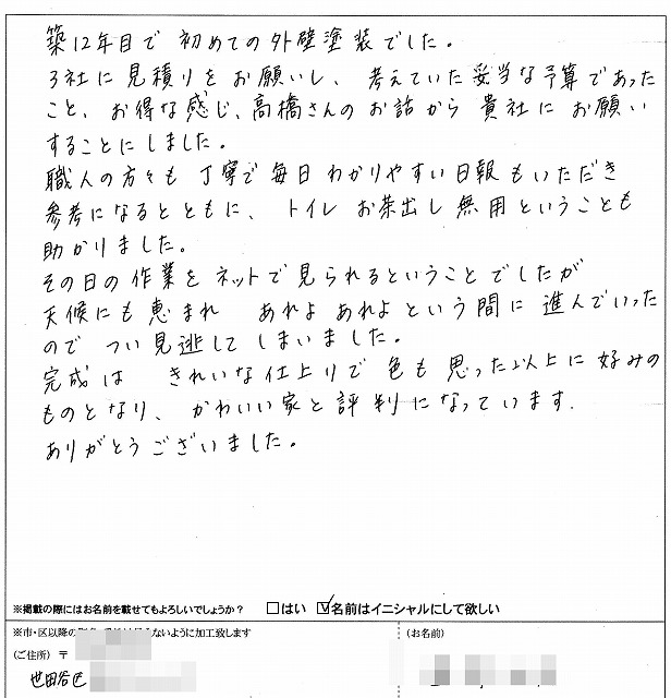 二世帯住宅を塗装された方から頂いた「お客様の声」をご紹介いたします