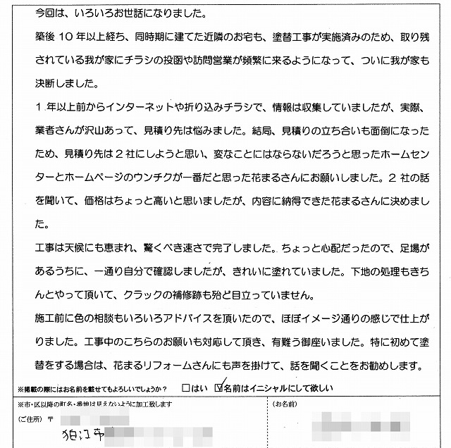 その他の塗装工事をご依頼頂いた方から頂いた「お客様の声」をご紹介いたします