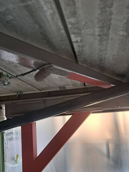 踊り場裏側の鉄骨部を塗装します。(エスケー化研 クリーンマイルドシリコン 調色)