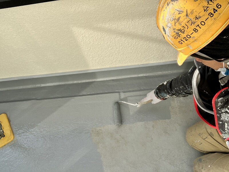 丁寧に塗り進めています。(日本特殊塗料 タフシールトップ #300 グレー)