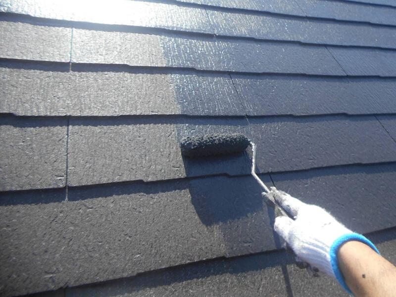 屋根の中塗りを行っています。(エスケー化研 クールタイトSi CLR-121)