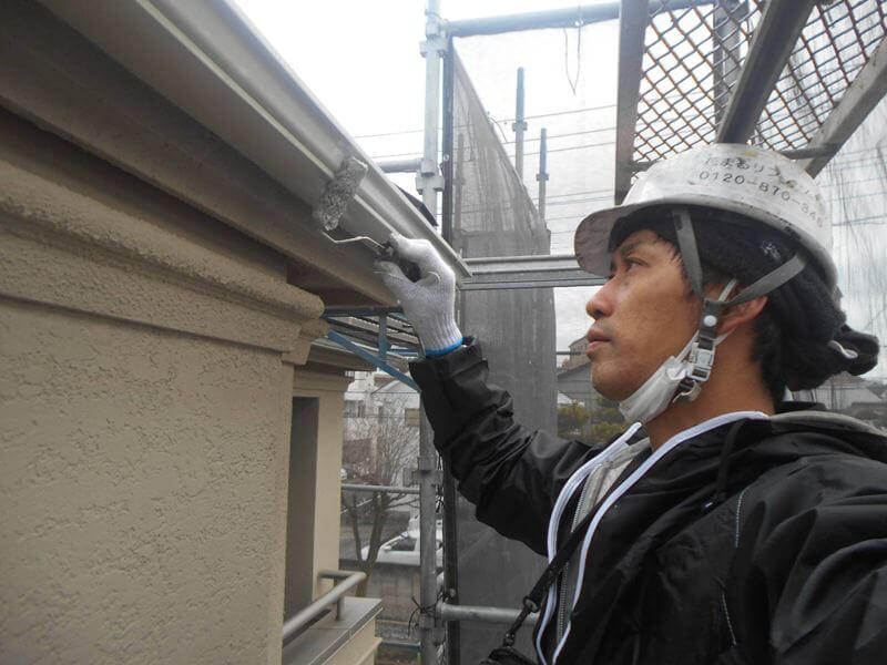 横樋を塗装しています。凹凸があるのでダメが出ないように慎重に作業します。(エスケー化研 クリーンマイルドシリコン 調色)