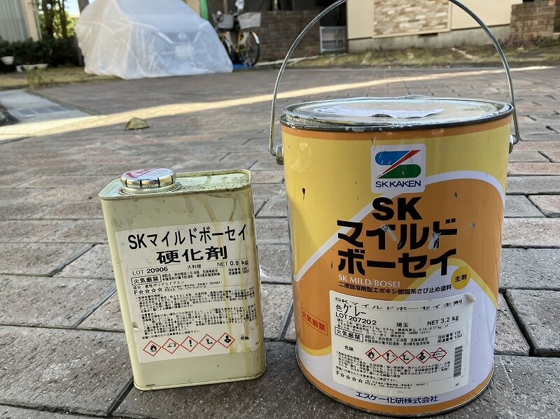 鉄部のさび止め塗装に使用した防さび材です。(エスケー化研 SKマイルドボーセイ グレー)