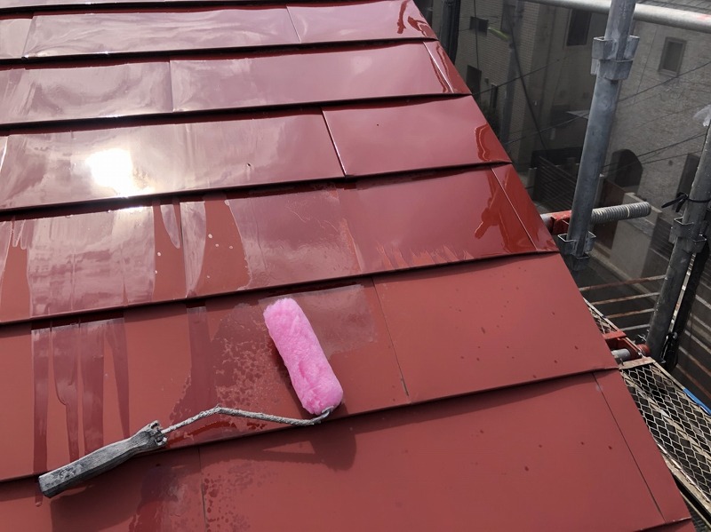 屋根の中塗りと上塗りは同じ塗料で行います(エスケー化研 クールタイトSi CLR-106)。