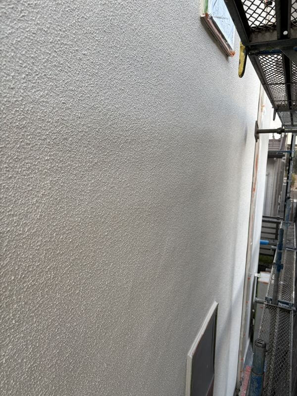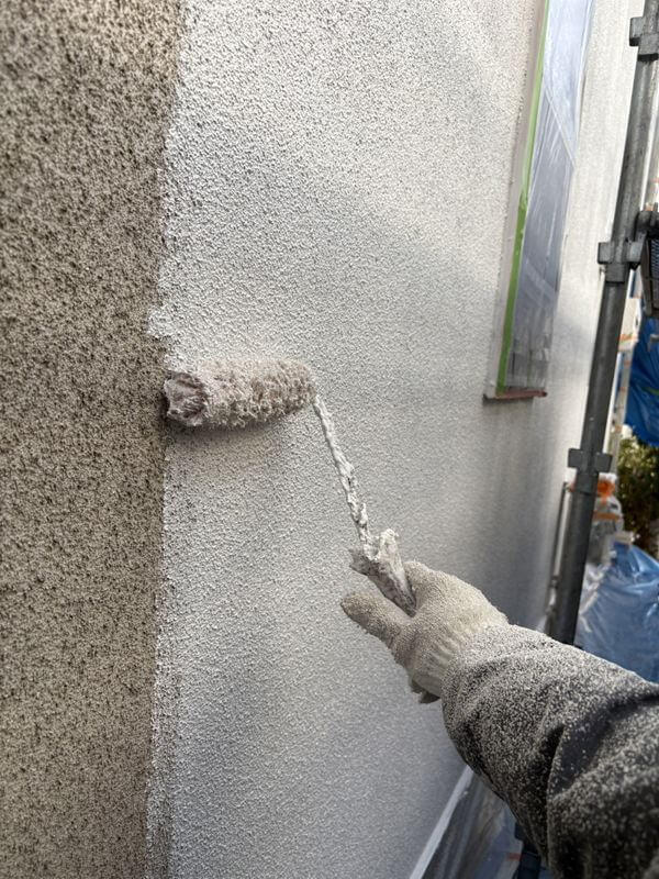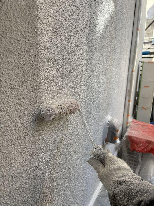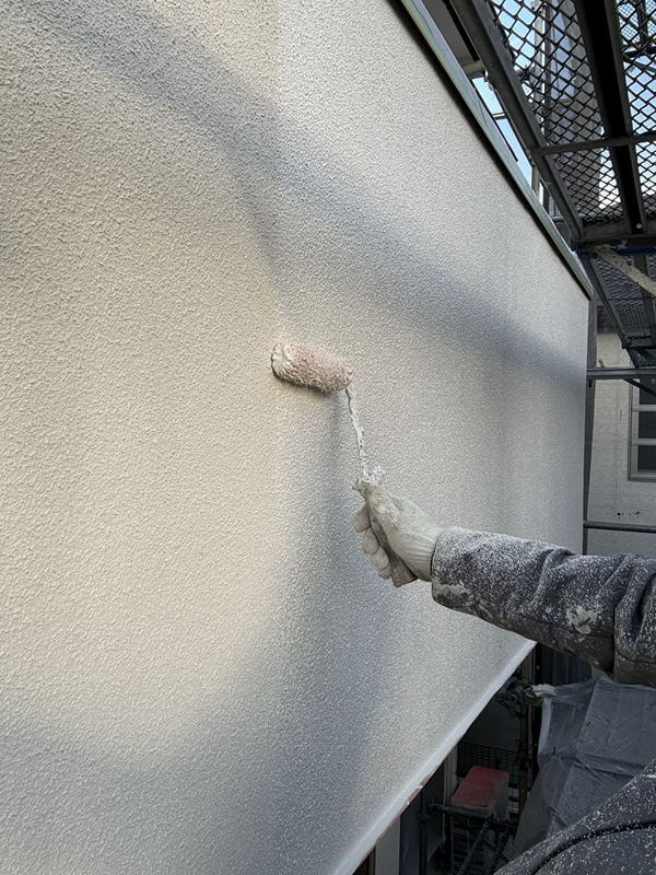外壁の中塗りを一番薄い色から中塗りしています。(エスケー化研 アートフレッシュ AC-1002)