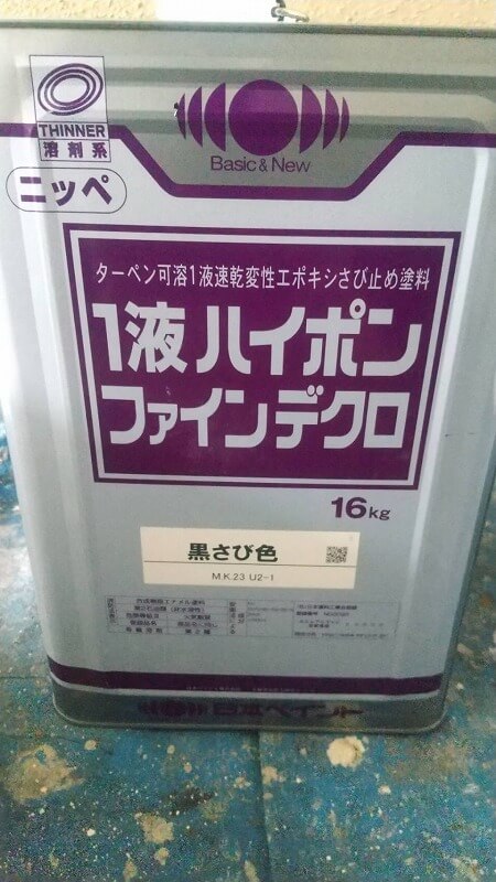 使用したサビ止め塗料です。(日本ペイント 1液ハイポンファインデクロ 黒さび色)
