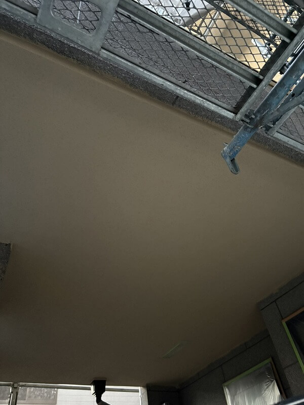 ベランダの天井部分も外壁と同じ素材なので、同じ塗料で中塗りしています。(エスケー化研 アートフレッシュ AC-2100)