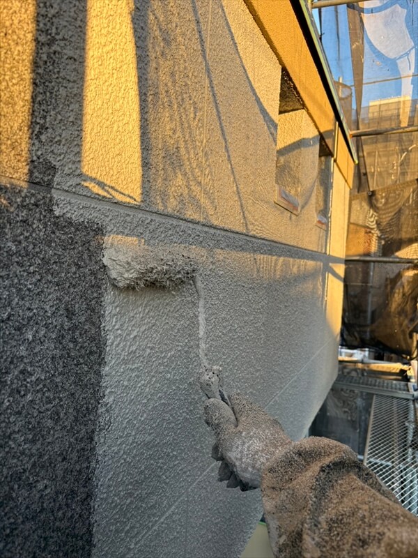 外壁の石目調部分の中塗りを行いました。(エスケー化研 アートフレッシュ AC-2030)