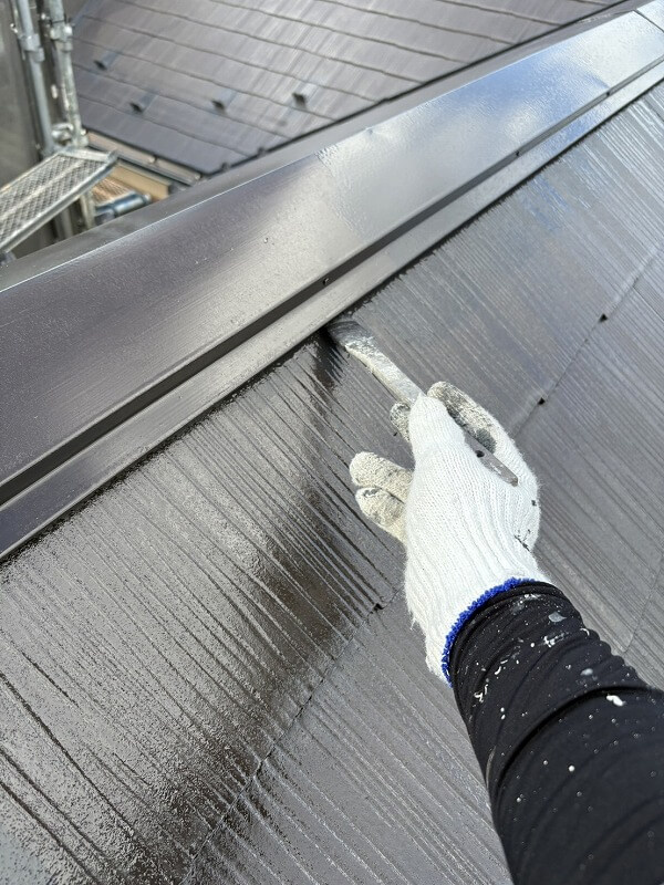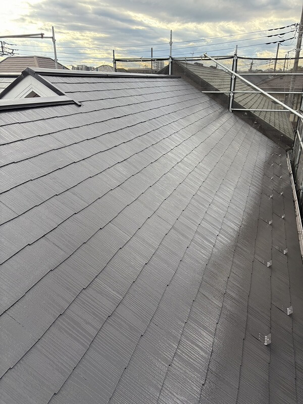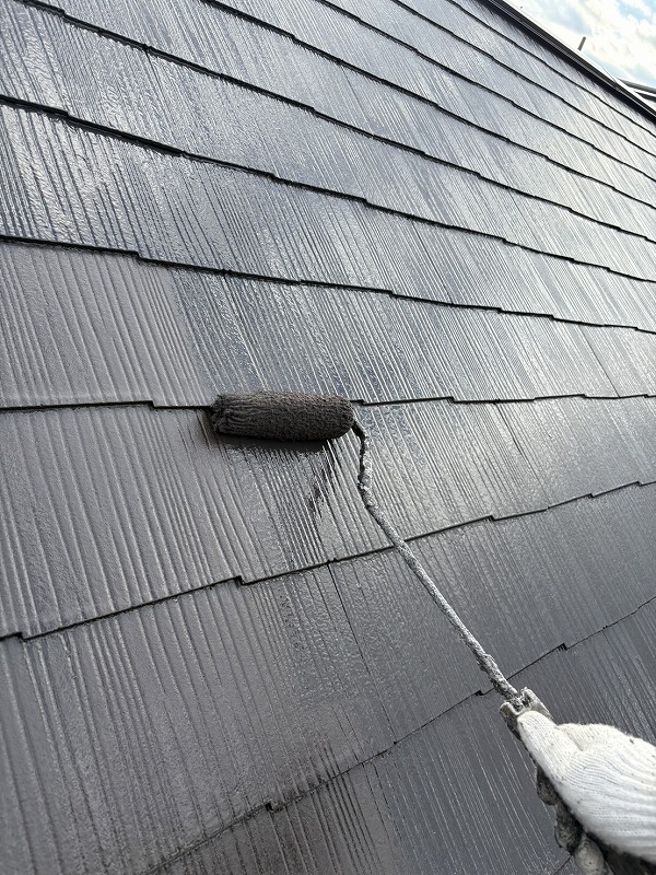屋根塗装は中塗りまで完了しました。(エスケー化研 クールタイトSi CLR-121 セピアブラウン)