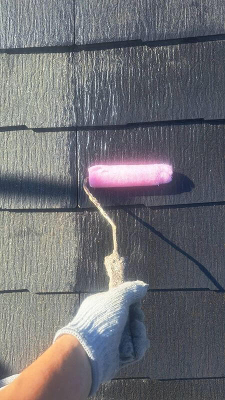 屋根の下塗り材を塗装しています。(エスケー化研マイルドシーラーEPO)