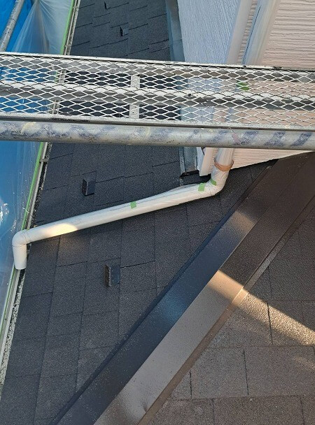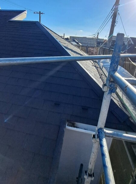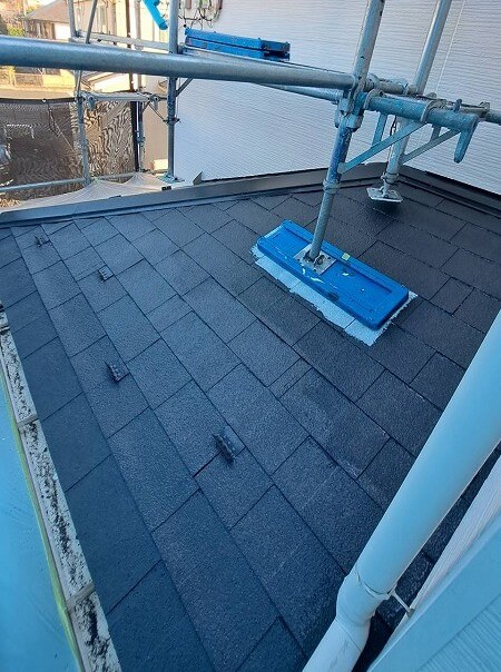屋根の中塗りが完了し、上塗りを進めています。(エスケー化研 水性クールタイトシリコン CLR-121 セピアブラウン)