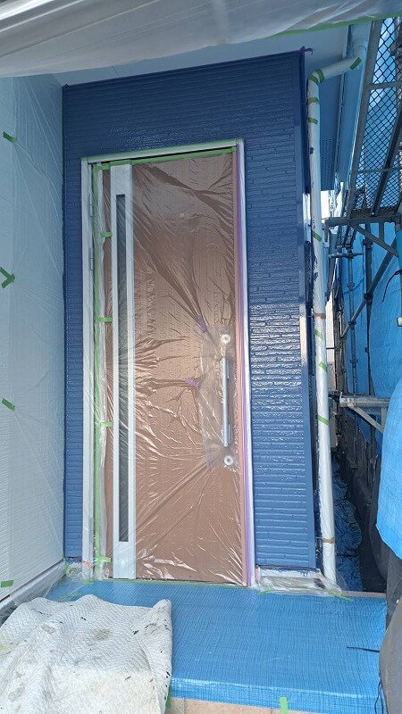 ドアや床は汚れないようにしっかりと養生しています。(エスケー化研 クリーンマイルドウレタン 75-40L)