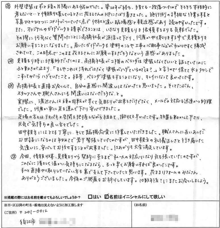 外壁塗装はずっと頭の片隅にある悩みでした。築20年が経ち、子育ても一段落ついたのでそろそろ本格的に考えないと...と情報収集しているときに花まるさんのHPにたどり着きました。施行例の詳細な作業工程と写真ひとつひとつにコメントがついていた点で他社と違い臨場感と親近感があり読みやすかったです。また、オリジナルのガイドブックを請求できることは、いきなり見積もりを依頼するよりも気軽でした。その際に何気なく質問したことに高橋社長が返信して下さり、何度かやり取りをする中で見積もりをお願いすることになりました。届いたガイドブックも塗料のことや工事の心配事などがわかりやすく構成されていて、この時点でこのまま花まるさんにお願いするだろうなという直感がありました。