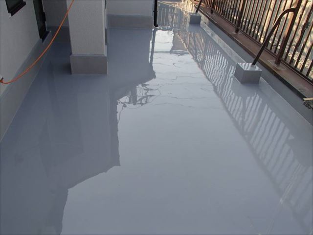 バルコニー床は全面ウレタン防水を更新しました。まるで鏡のように輝いています。 |