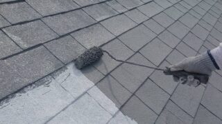 屋根の上塗り中です。(エスケー化研 水性クールタイトシリコン CLR-106 グレー)