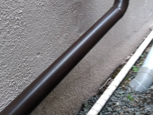 雨樋が壁まで入らないため、壁側の雨水が雨樋に流れるよう誘導する金具を取り付けました。