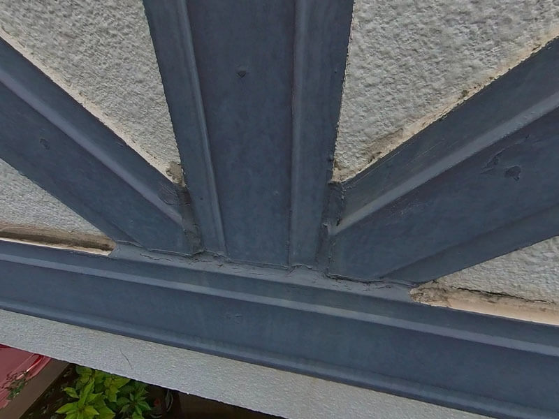 帯板と飾り板部分の複雑な形に雨が溜まりやすく、はがれやすくなります。
