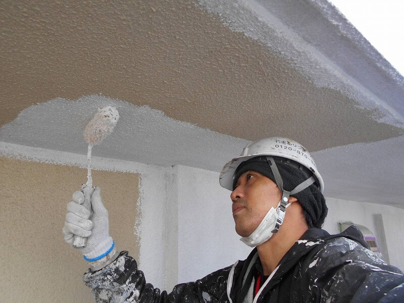 ローラーに長柄をつなげて、遠い部分もしっかりと塗装しています。